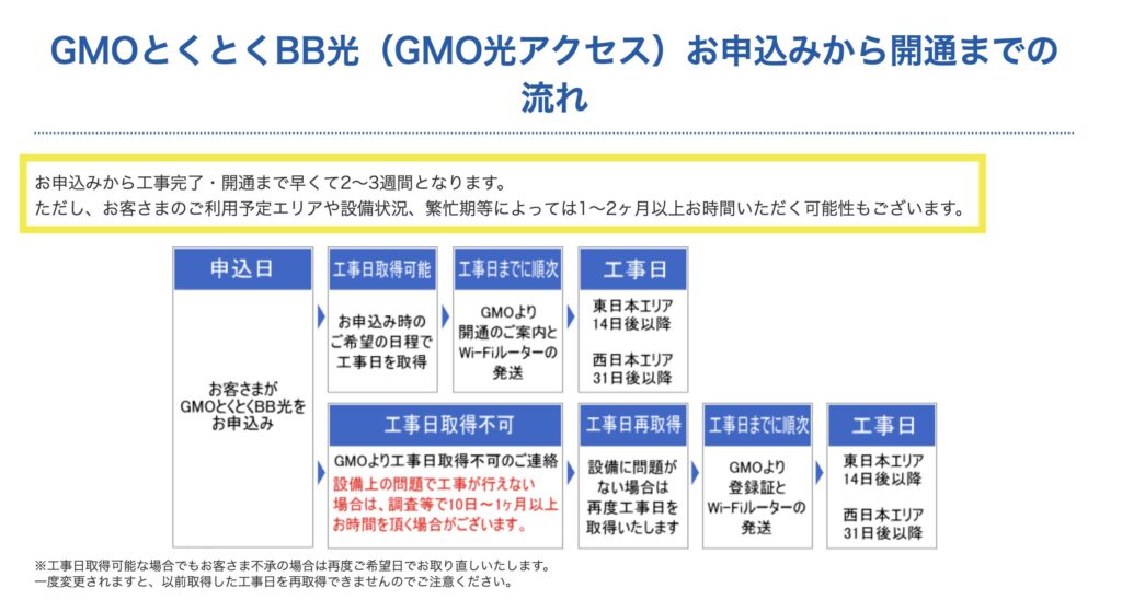 GMOとくとくBB光は申し込みから最短2~3週間で開通(繁忙期は最大2ヶ月)