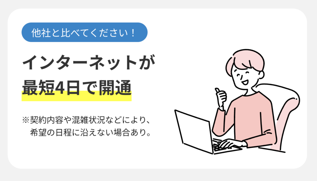 工事の日程調整や、物件の管理会社・大家さんからの許可が必要な場合もあり、開通までに時間がかかることがあります。