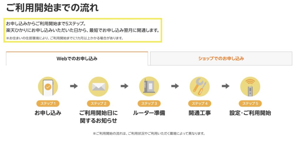 楽天ひかりの開通目安は約1ヶ月(手続き方法によって短縮も可能)