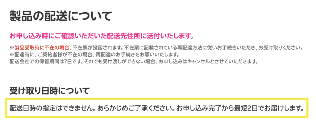 配送地域によっては3日以上かかることもあり、「即日利用」には不向きです。