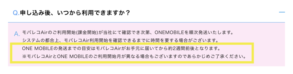 ONE MOBILEは利用開始の確認後に発送され、到着まで約2週間が目安